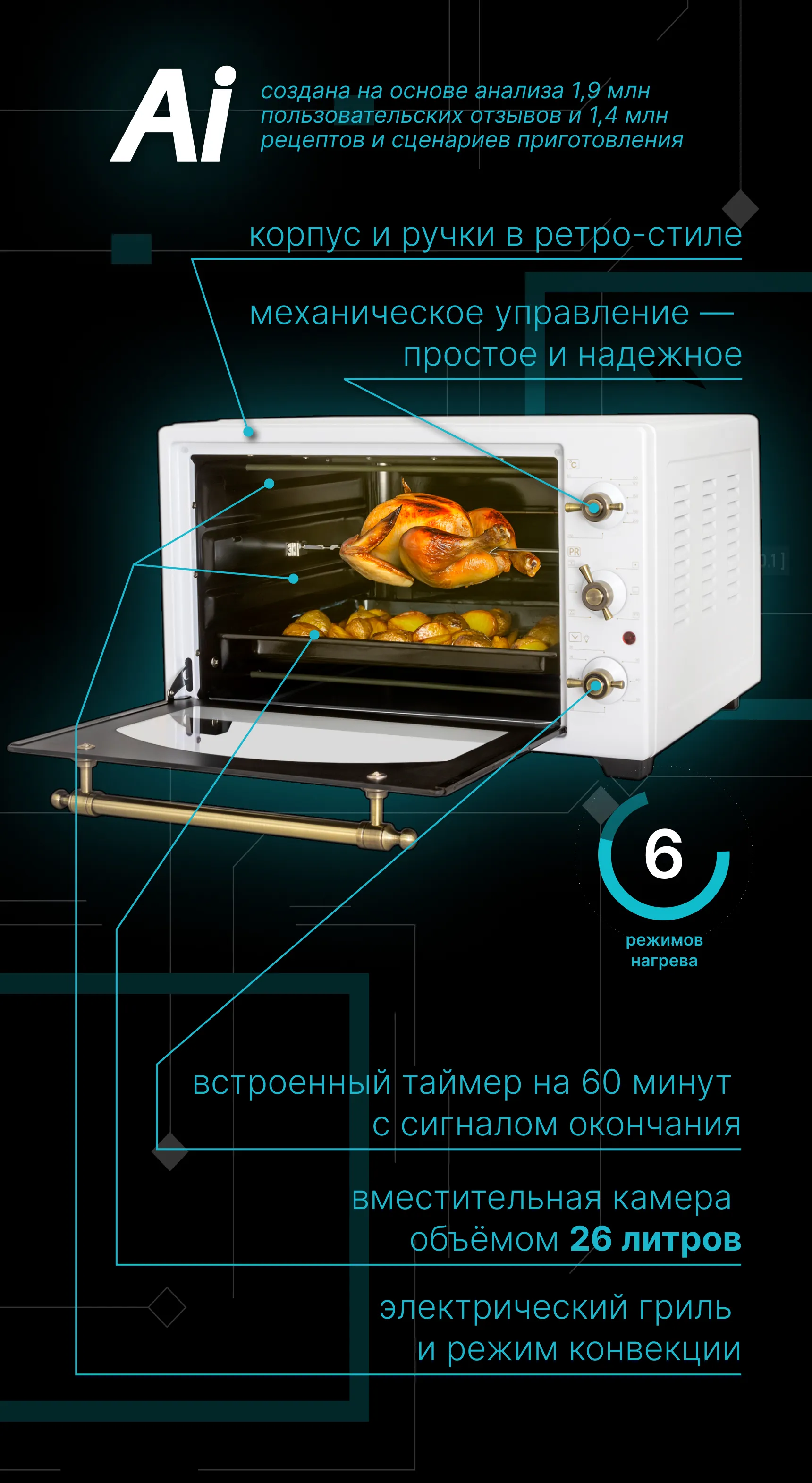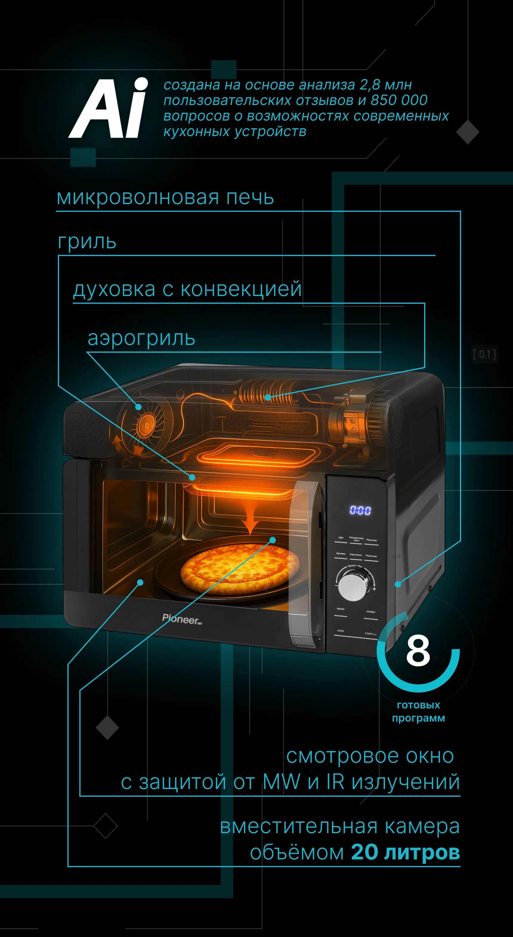 Pioneer MO5202G — это многофункциональная настольная электропечь, разработанная на основе 2,8 миллиона отзывов, 1,9 миллиона кулинарных запросов и 970 тысяч анализов кулинарных процессов.