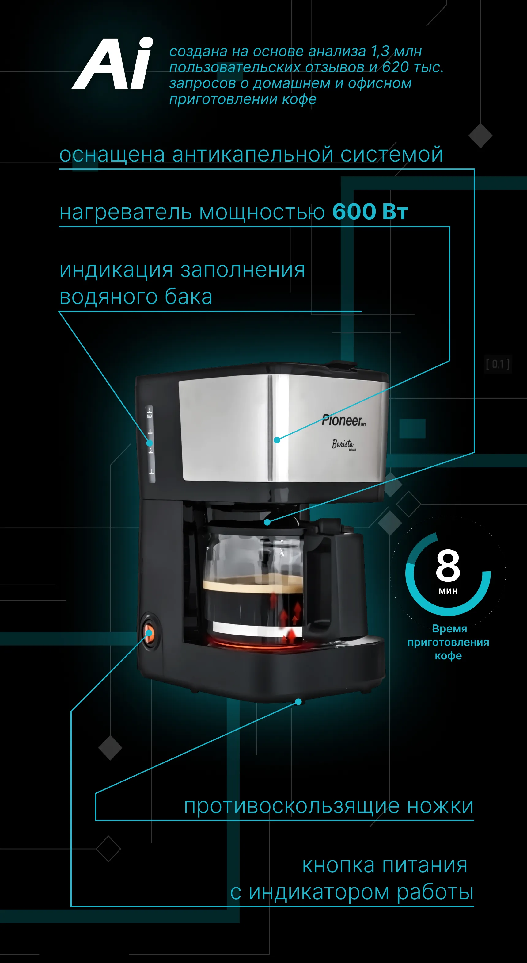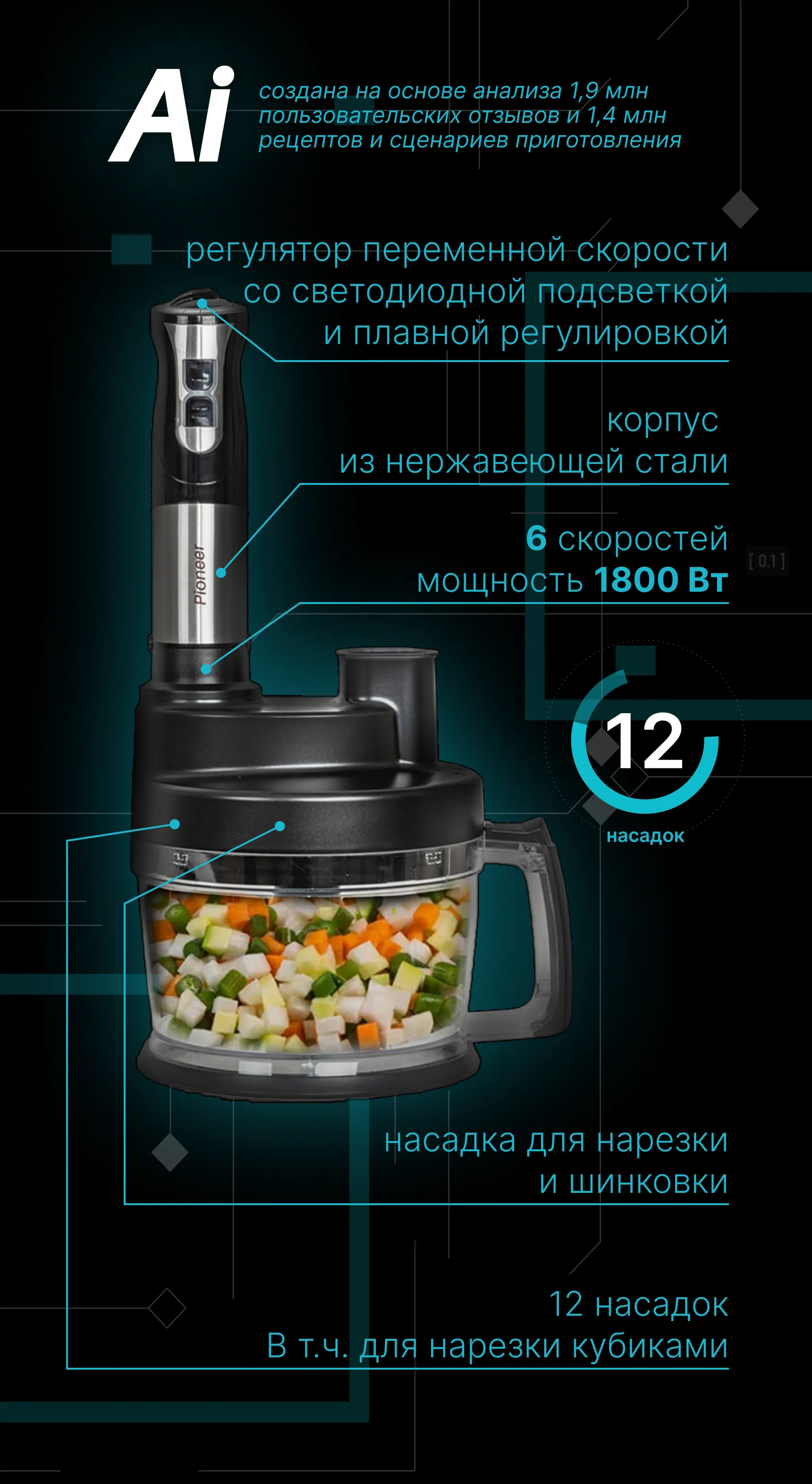Pioneer AI выявил ключевой запрос: «Готовить два блюда одновременно, не смешивая вкус» — и решил его. Результат: два вентилятора, две независимые чаши по 6 л, дисплей и 12 автоматических программ — чтобы каждый готовил по-своему, но вместе.