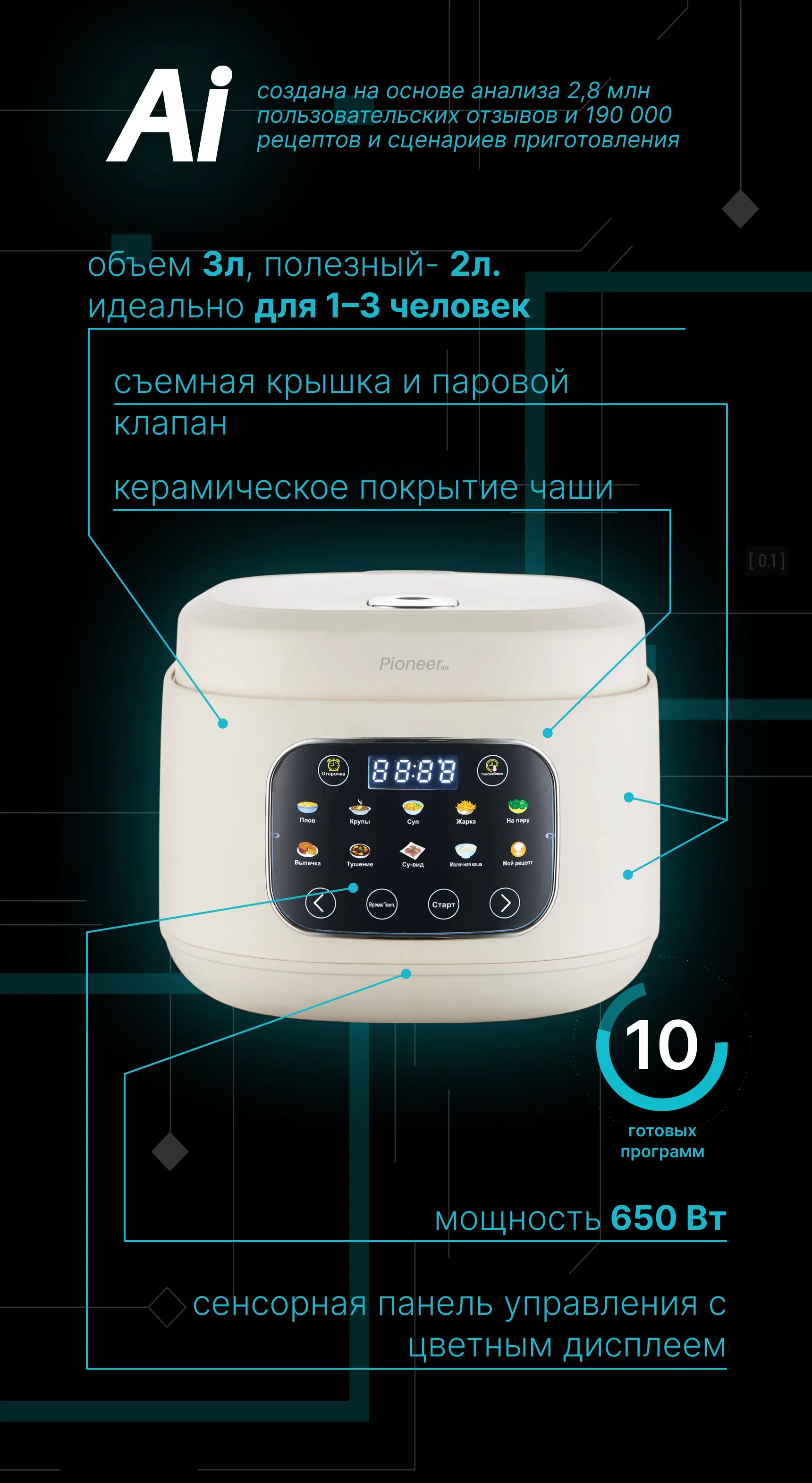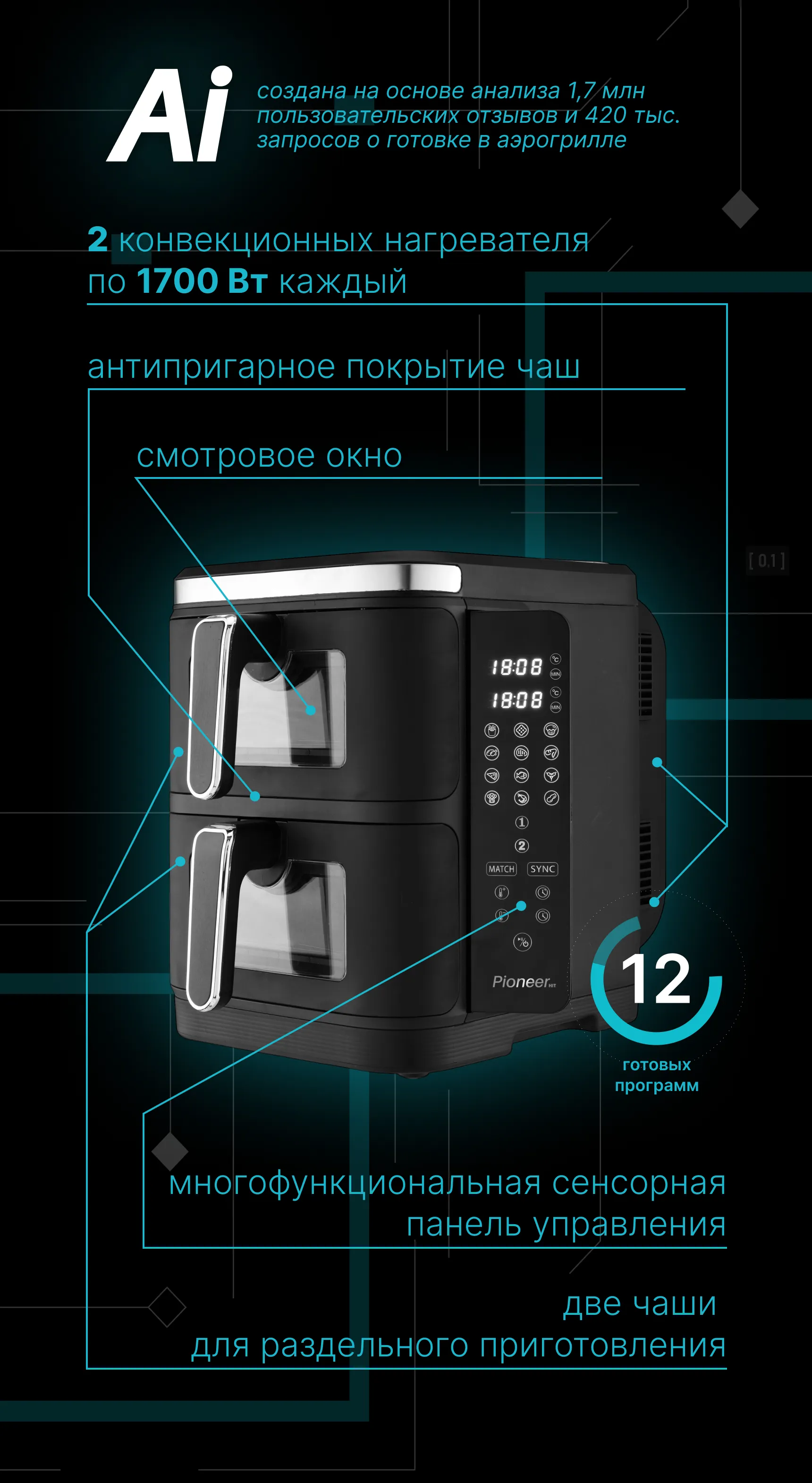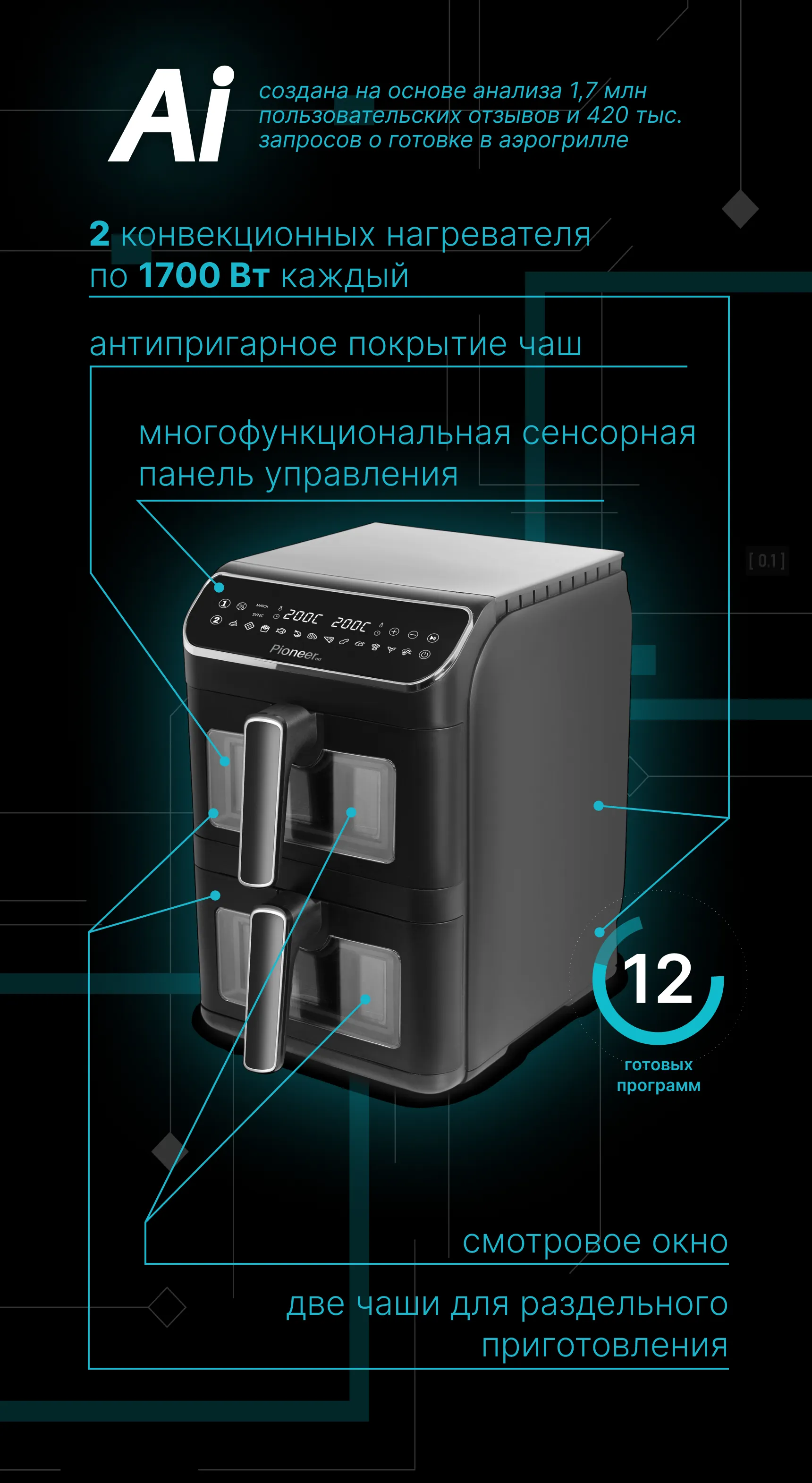 Pioneer AI выявил ключевой запрос: «Готовить два блюда одновременно, не смешивая вкус» — и решил его. Результат: два вентилятора, две независимые чаши по 6 л, дисплей и 12 автоматических программ — чтобы каждый готовил по-своему, но вместе.