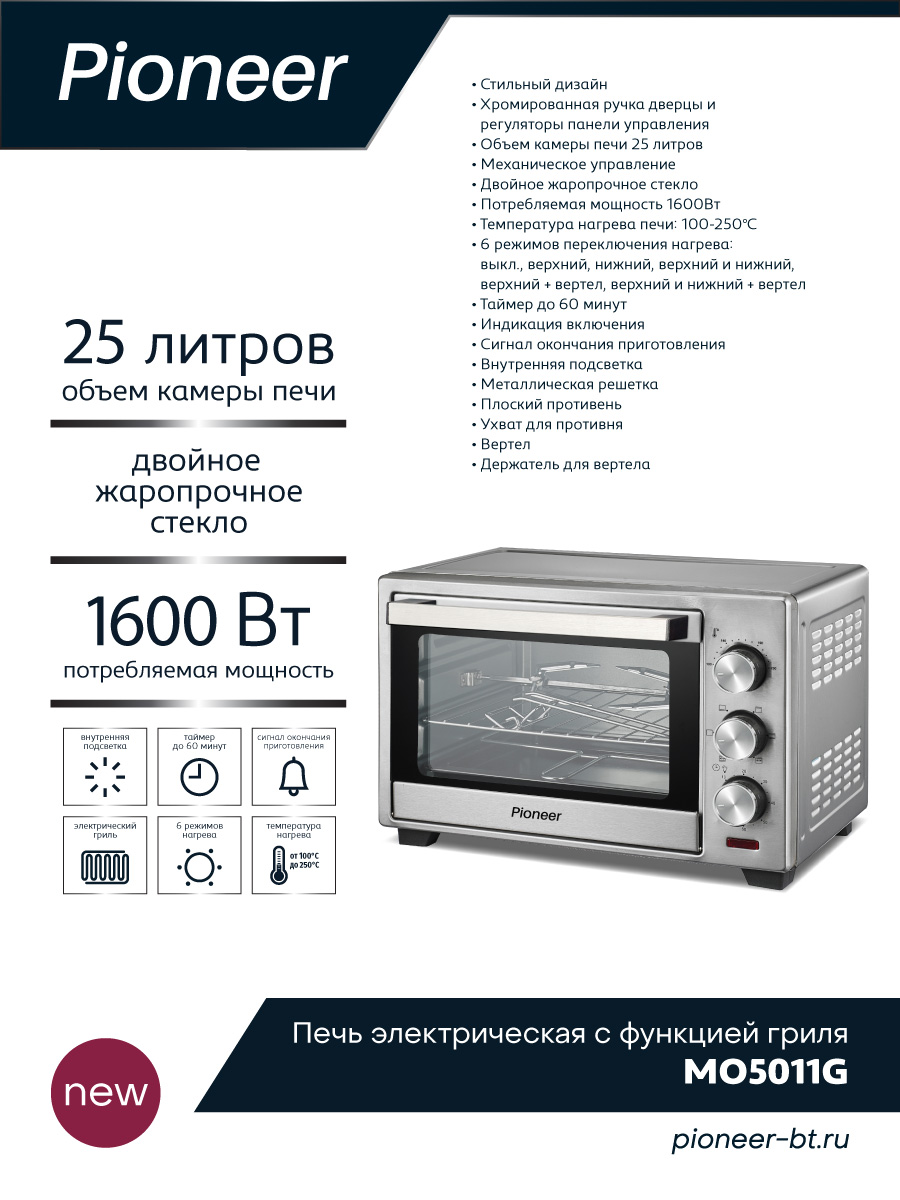 - Комплектация: электропечь, металлическая решетка, плоский противень, вертел, держатель для вертела, ухват, гарантийный талон, инструкция на русском языке