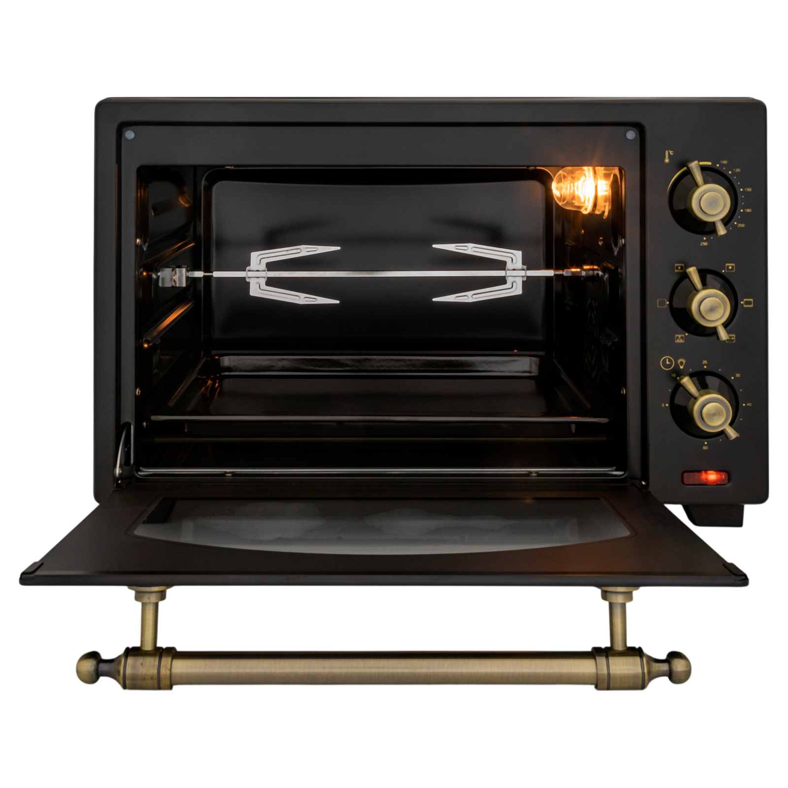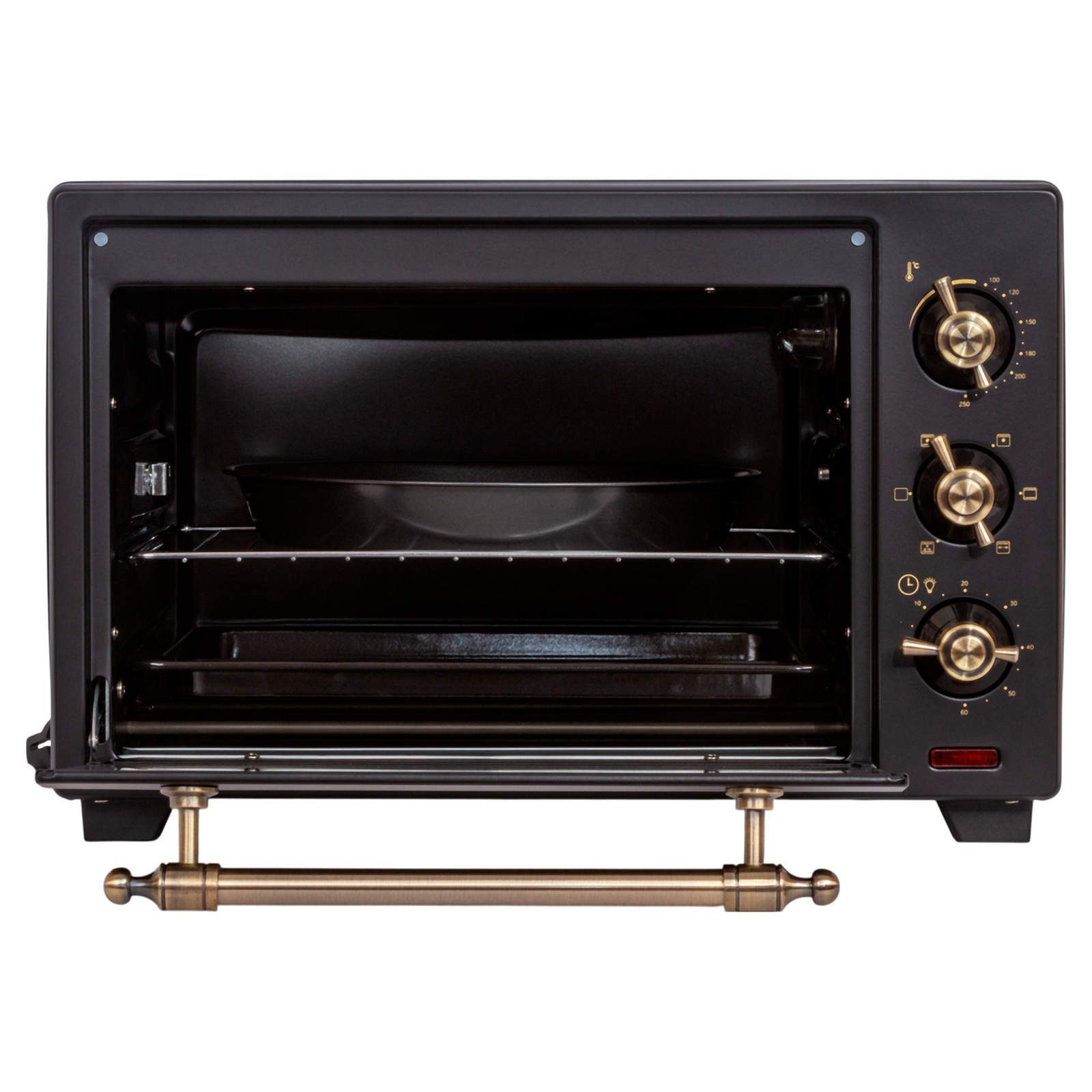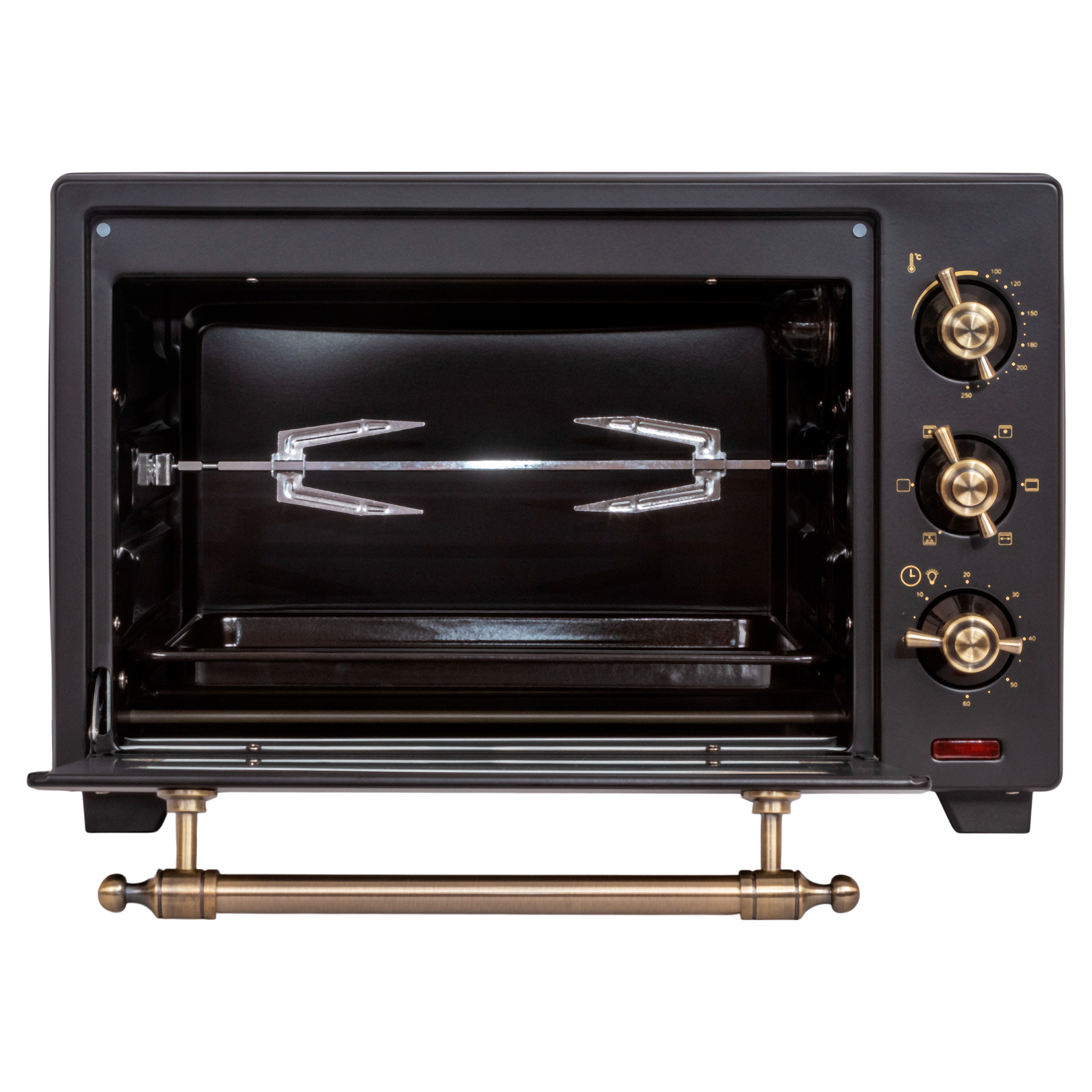 - Комплектация: электропечь, решетка, поддон для запекания, ухват для поддона, вертел, держатель для вертела, поддон для крошек, форма для пиццы, гарантийный талон, инструкция на русском языке