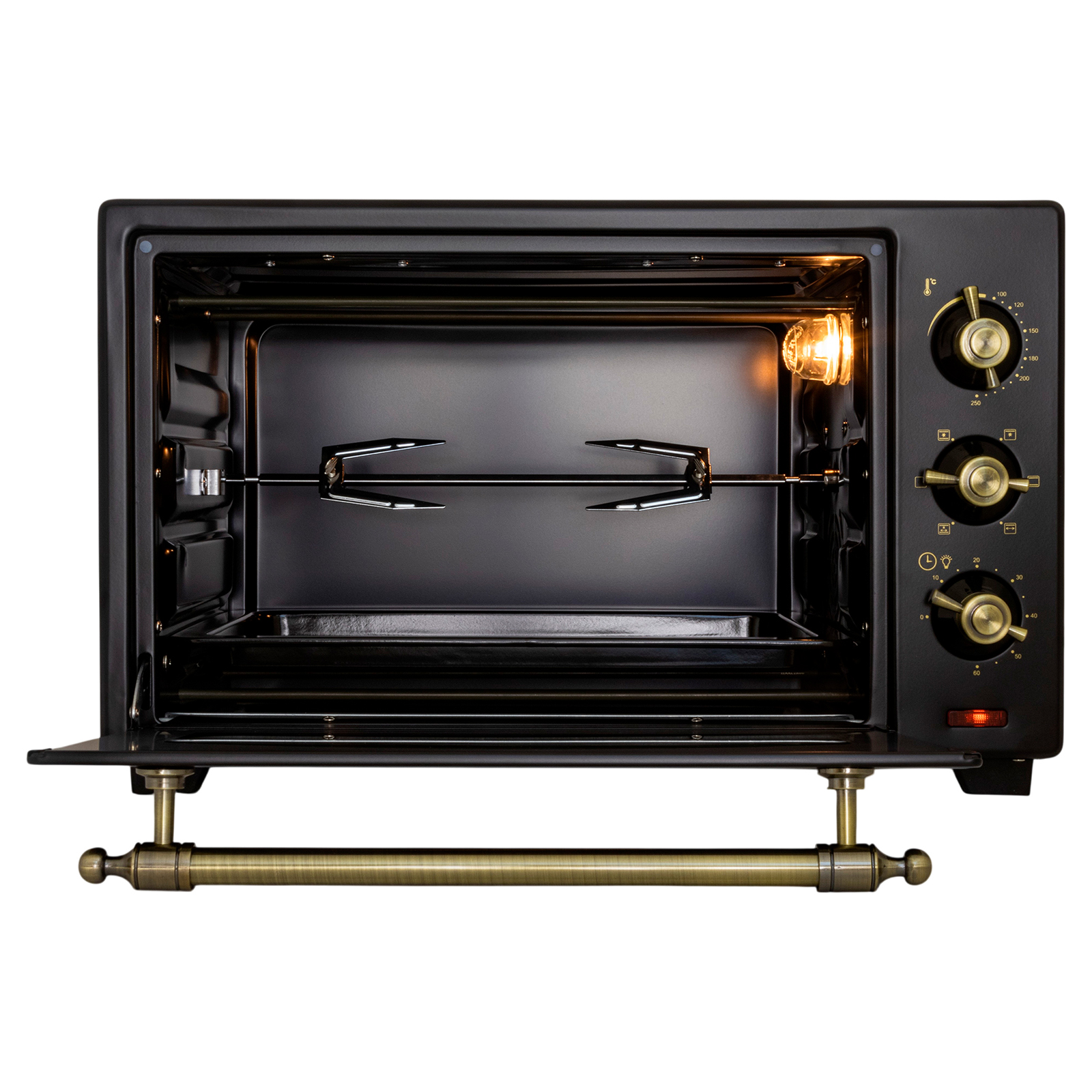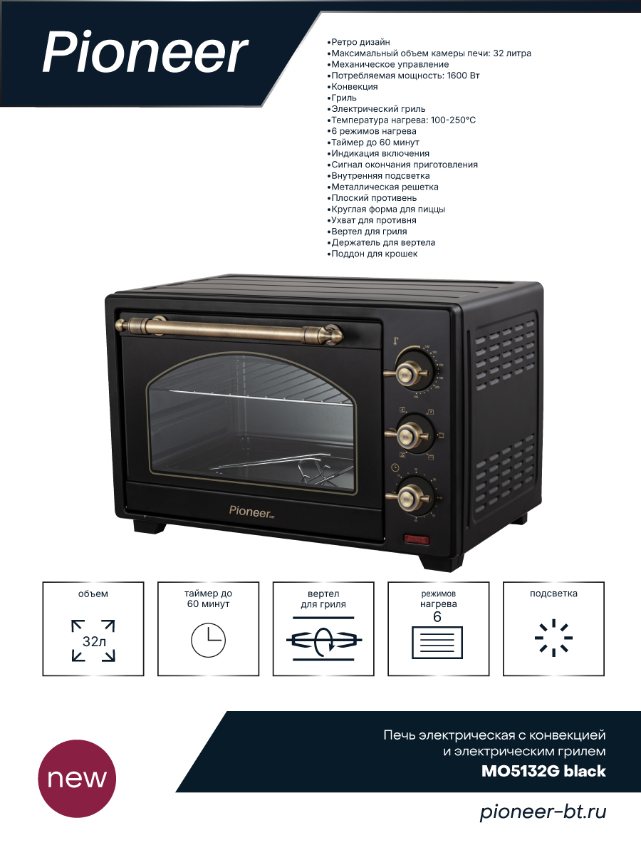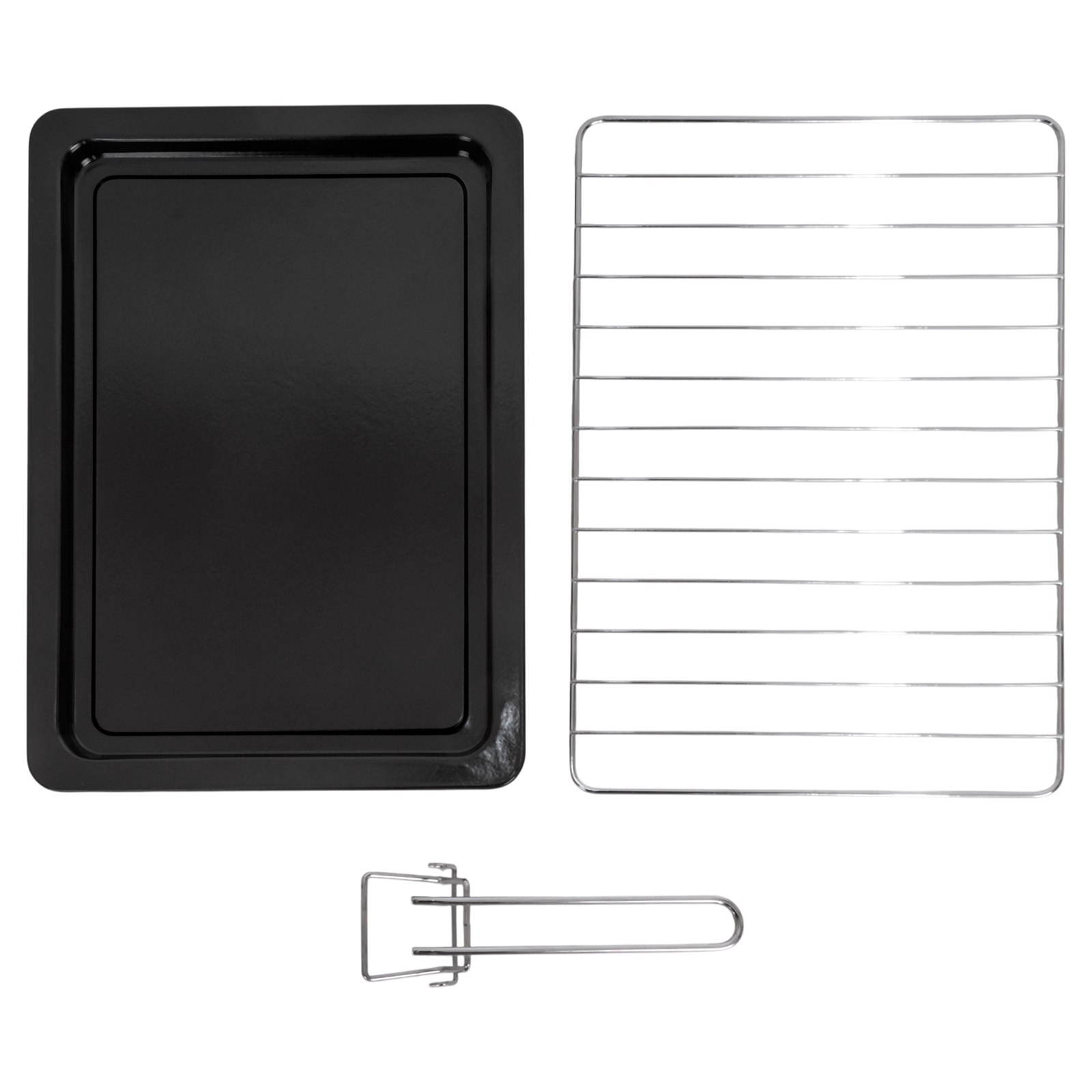 - Комплектация: электропечь, решетка, противень для запекания, ухват для поддона, вертел, держатель для вертела, поддон для крошек, форма для пиццы, антипригарный коврик для выпечки (запекания) (в комплекте с версии V2), насадка для шашлыка/кебаба (в комплекте с версии V2), гарантийный талон, инструкция на русском языке