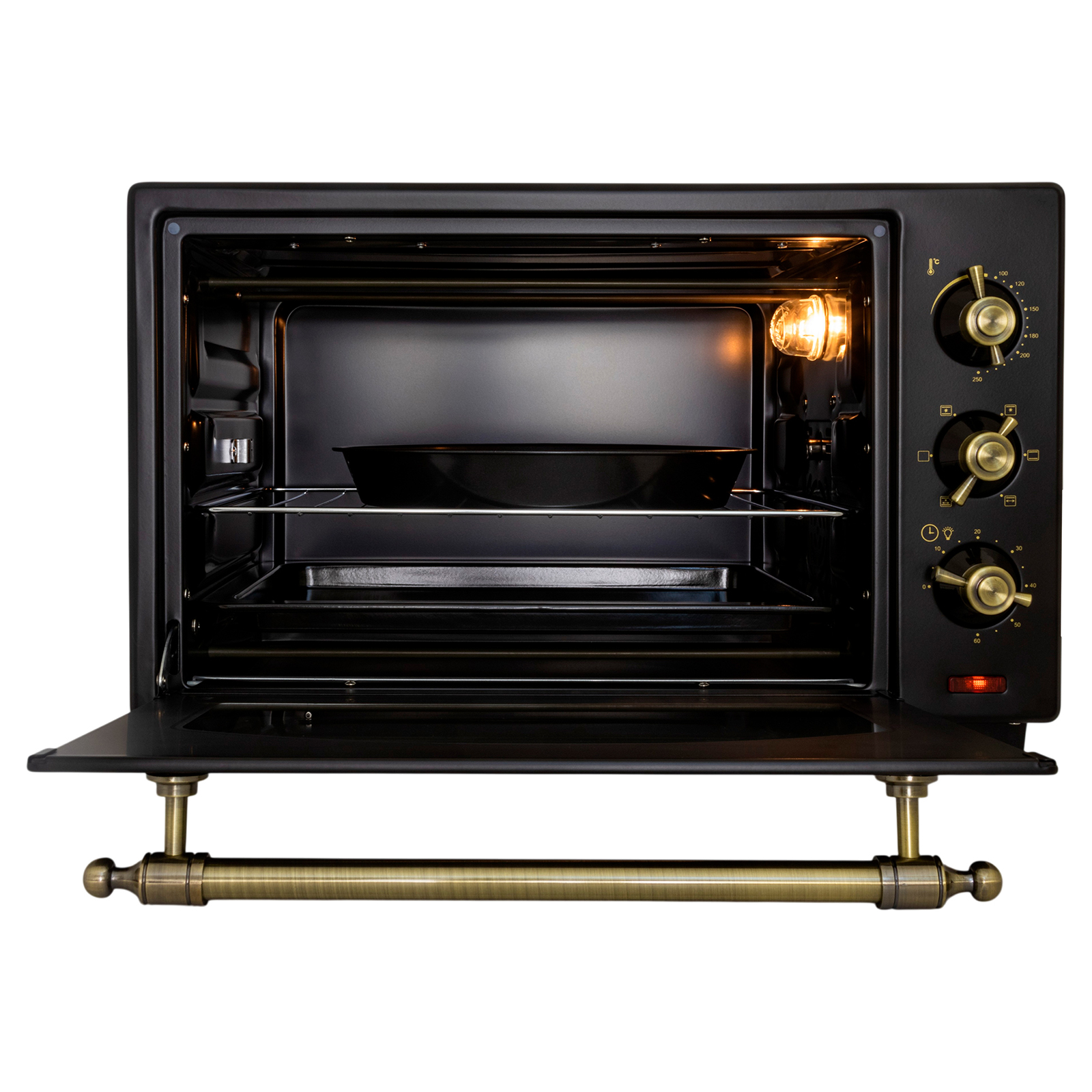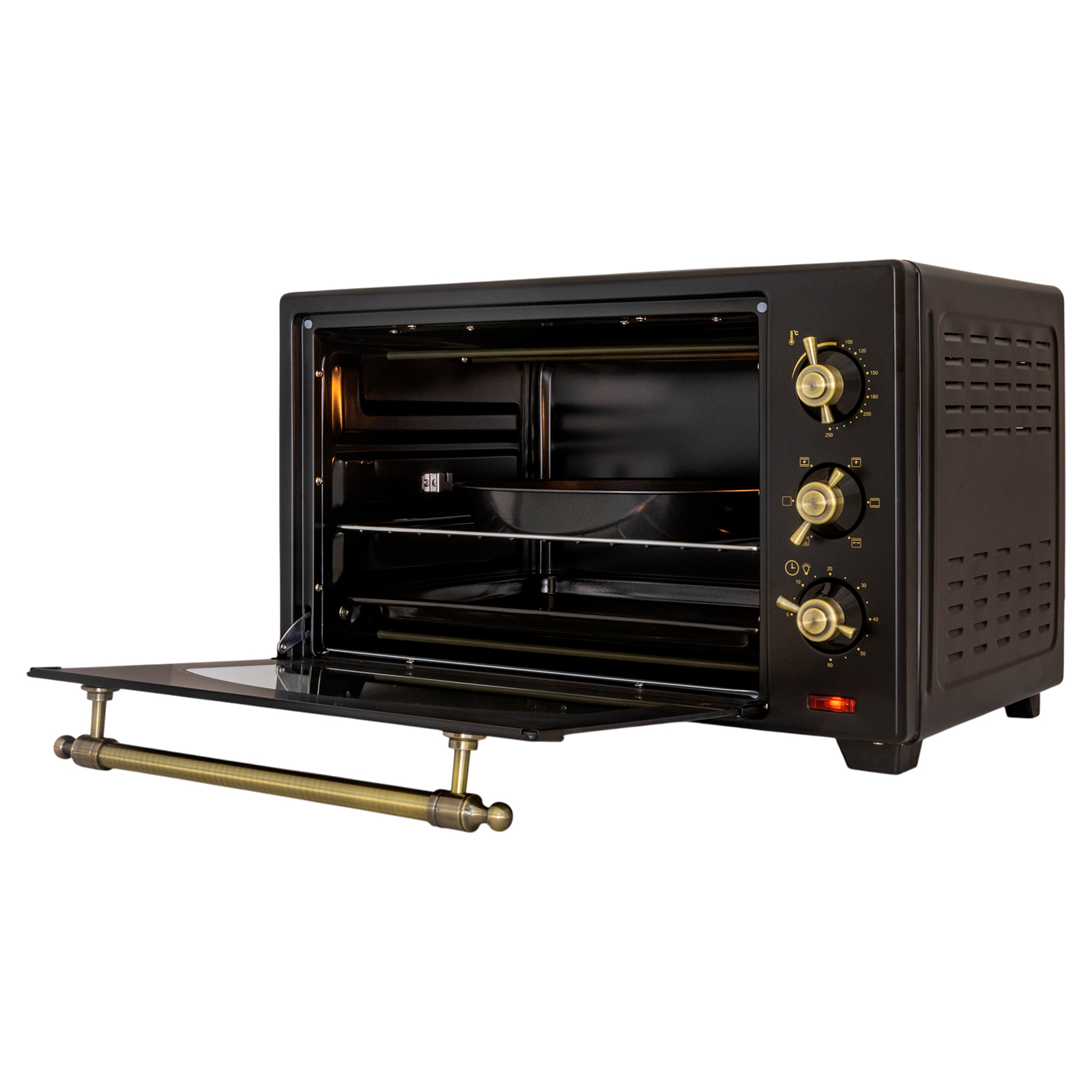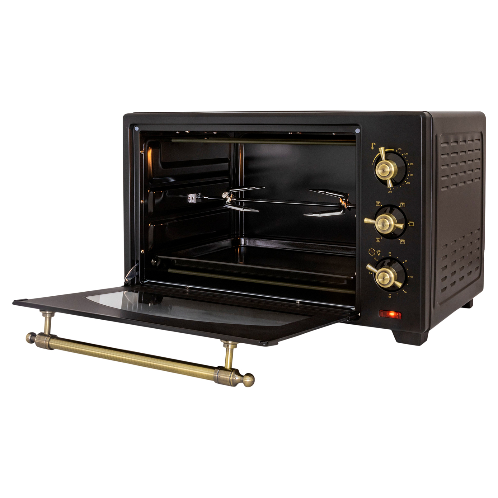 - Комплектация: электропечь, решетка, противень для запекания, ухват для поддона, вертел, держатель для вертела, поддон для крошек, форма для пиццы, антипригарный коврик для выпечки (запекания) (в комплекте с версии V2), насадка для шашлыка/кебаба (в комплекте с версии V2), гарантийный талон, инструкция на русском языке