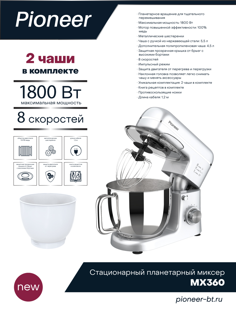 - Комплектация: миксер, чаша с ручкой из нержавеющей стали, дополнительная полипропиленовая чаша, крышка чаши, крючок для замеса теста, лопатка для перемешивания, венчик для взбивания, лопатка, книга рецептов, гарантийный талон, инструкция на русском языке