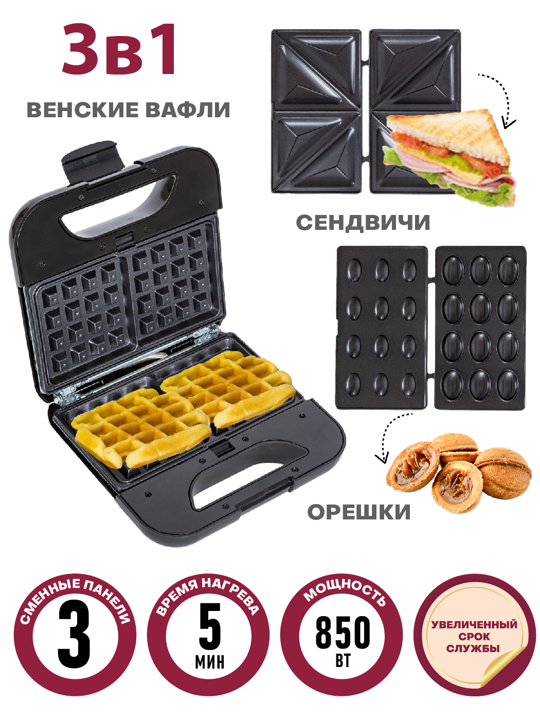 - Комплектация: электрический гриль, панели для сэндвичей, панели для выпечки венских вафель, панели для печенья «орешки», гарантийный талон, инструкция на русском