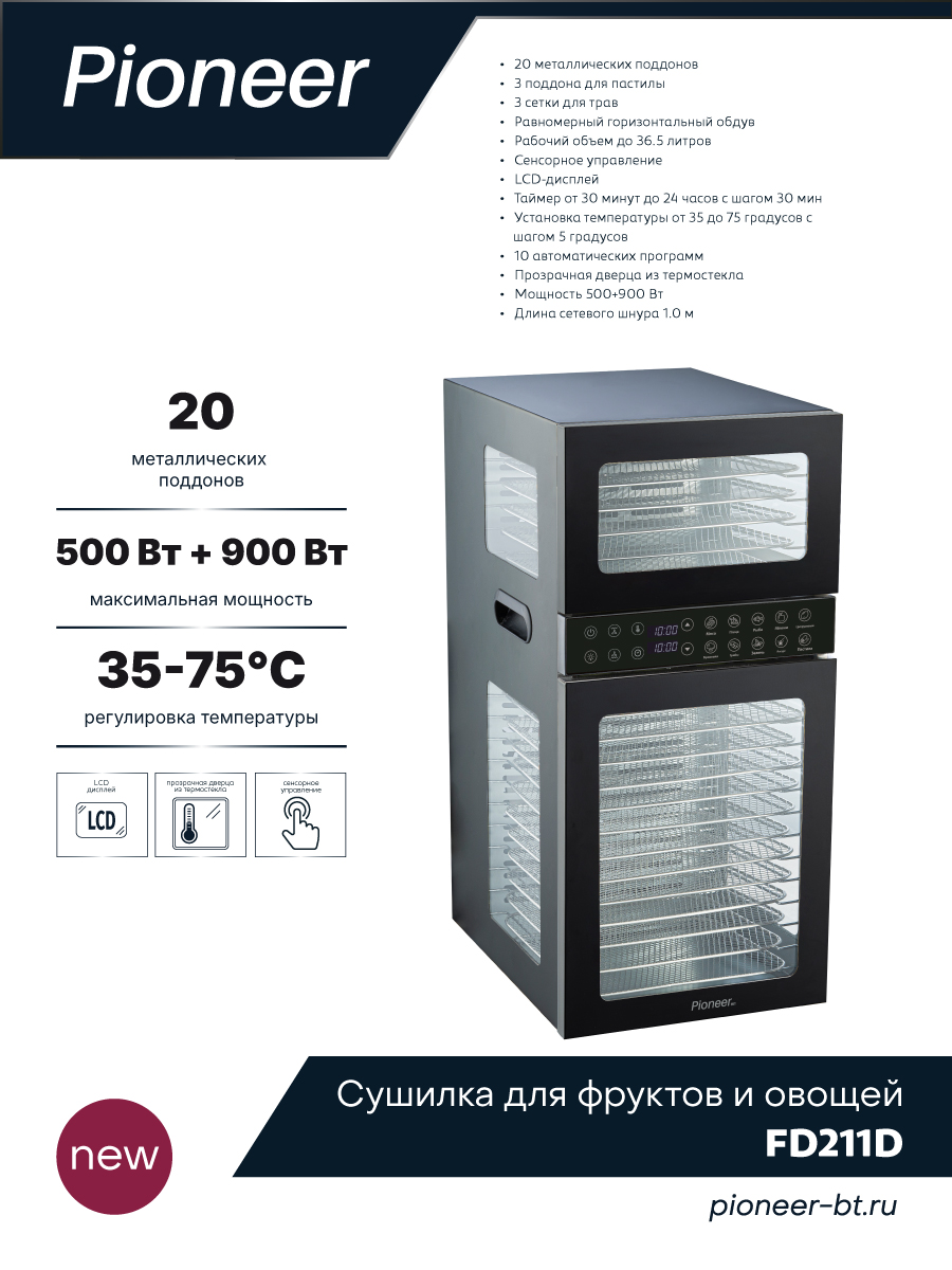 - Комплектация: сушилка, 20 металлических поддонов, 3 поддона для пастилы, 3 сетки для трав, гарантийный талон, инструкция на русском языке